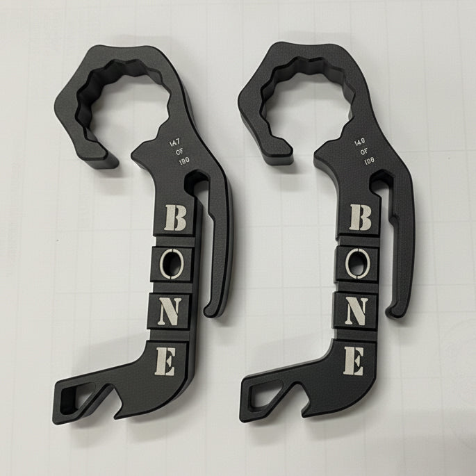 Made from solid 6061 Aircraft Aluminum (an extremely tough alloy) the Bone Berserker combines heirloom-quality craftsmanship with robust functionality. It's matte black color anodizing is both nondescript and unassuming yet the tool itself harks back to the good ol' days, when our grandfathers may have carried a similar tool made of brass... combining aesthetic appeal with unmatched durability. Yet, the sleek form and discreet profile make it ideal for non-permissive environments, where many other tools may be restricted.