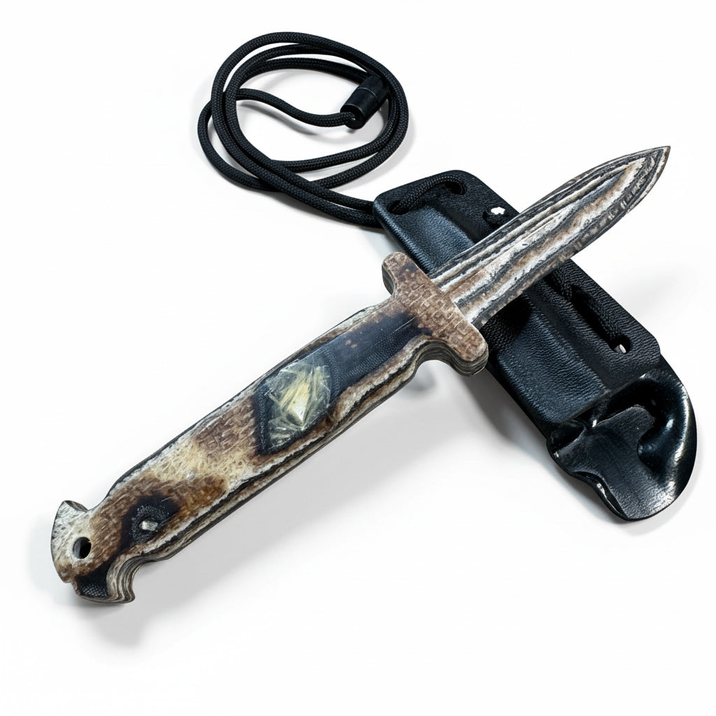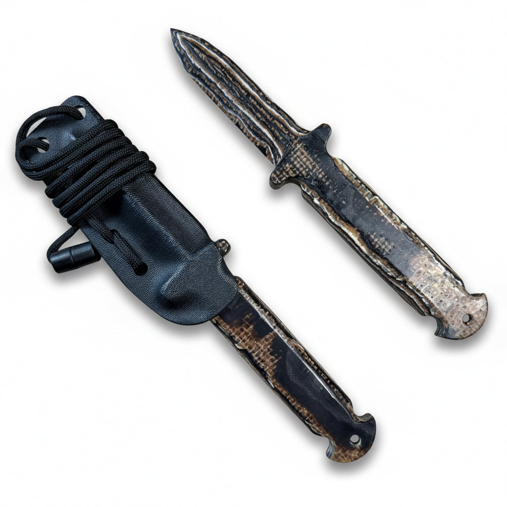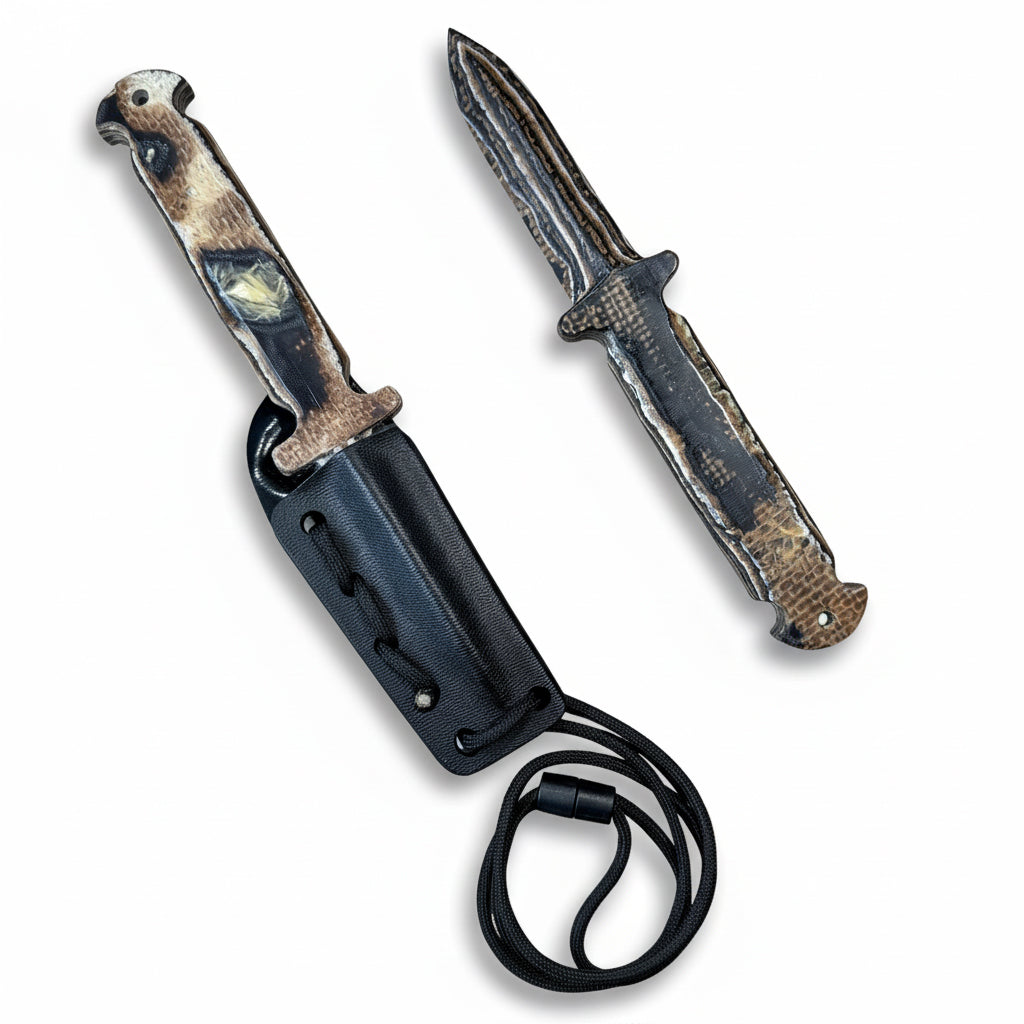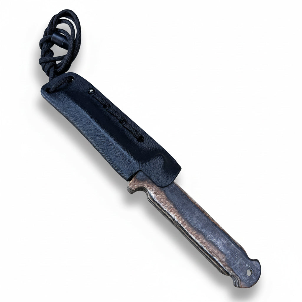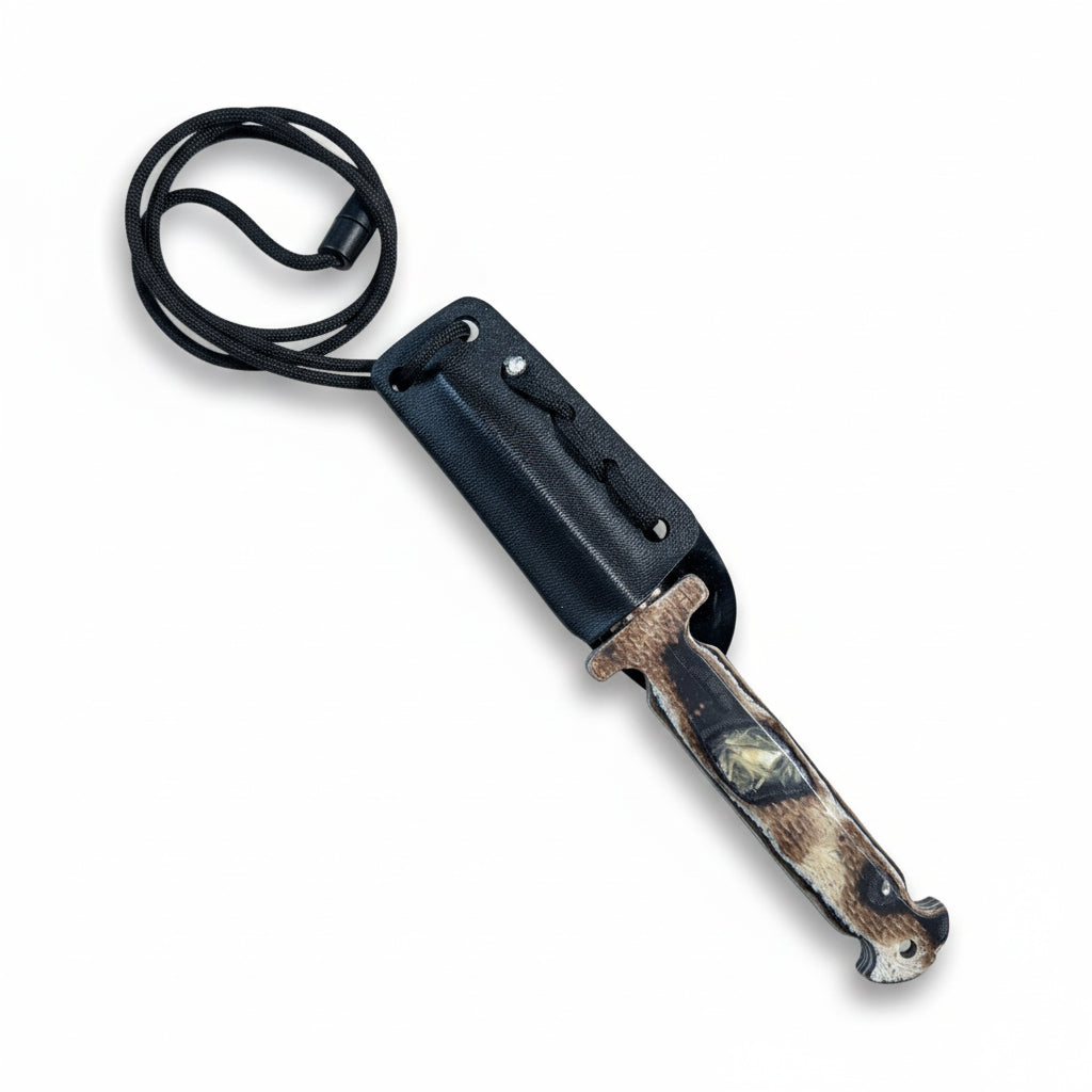 The Bonedurantium Ghost Spike features a thermoplastic sheath and a nylon paracord lanyard with a plastic pressure release barrel snap for safety. Versatile attachment options include 1/4" holes in the sheath for clip option modularity or secure taping and strapping for concealed carry. We recommend purchasing the Non-Magnetic IWB Clip available for purchase separately here on the site should one choose to carry inside the waistband.