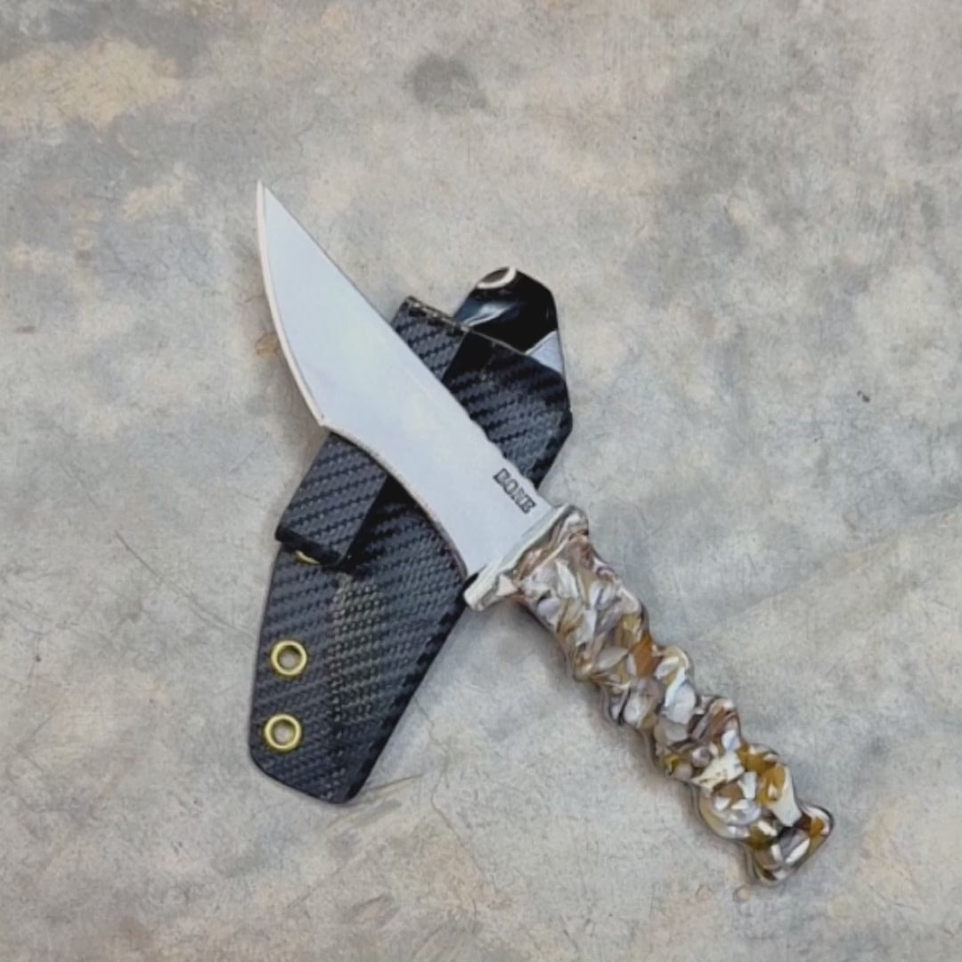 The Daimyo Kogatana is the ultimate functional art piece. Merging the absolute rarest exotic materials with 100% hand made custom craftsmanship and martial blade know-how... this knife represents the pinnacle of collector quality blades. This combination of such an effective tool design built for extreme hard use while featuring world-class craftsmanship and utilizing rare materials of this caliber has not been seen in the knife world until now. The blade itself is made from stonewashed S30V steel, a "super steel" known for its corrosion resistance and low maintenance requirements. The handle is one solid piece of crystal clear epoxy resin infused with amblemine shells discovered near ancient Mayan ruins and cured in a vacuum chamber. The same shell that was once a prized treasure of a Mayan warrior chieftain is now permanently preserved in the handle of this exquisite piece. The custom sheath is carbon fiber print thermoplastic with bronze rivets and comes complete with it's own IWB clip and hardware. As always, every process of making this knife was done in house... allowing us to lead the market in custom blade production quality.