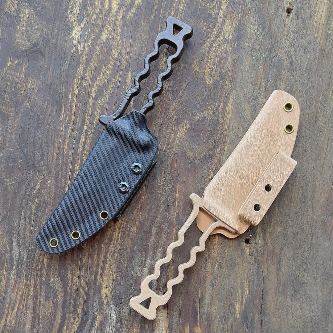 The fully ambidextrous and modular sheath system comes ready for IWB carry with a Bone Tactical IWB clip included. Bronze eyelets are 3/4" on center (industry standard) so as to allow for attachment to kit or upgrades such as an UltiClip for pocket carry. The Modern Warrior version comes standard in a muted colorway which mimics natural skin tones and blends easily in both urban and rural environments while offering low light reflection with a minimal IR signature.