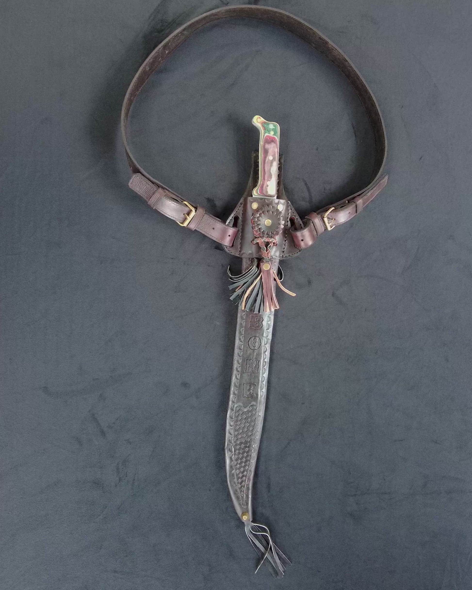 Sheath: Hand tooled and hand selected leather with solid bronze accessories. Belt loop and carrying strap included.