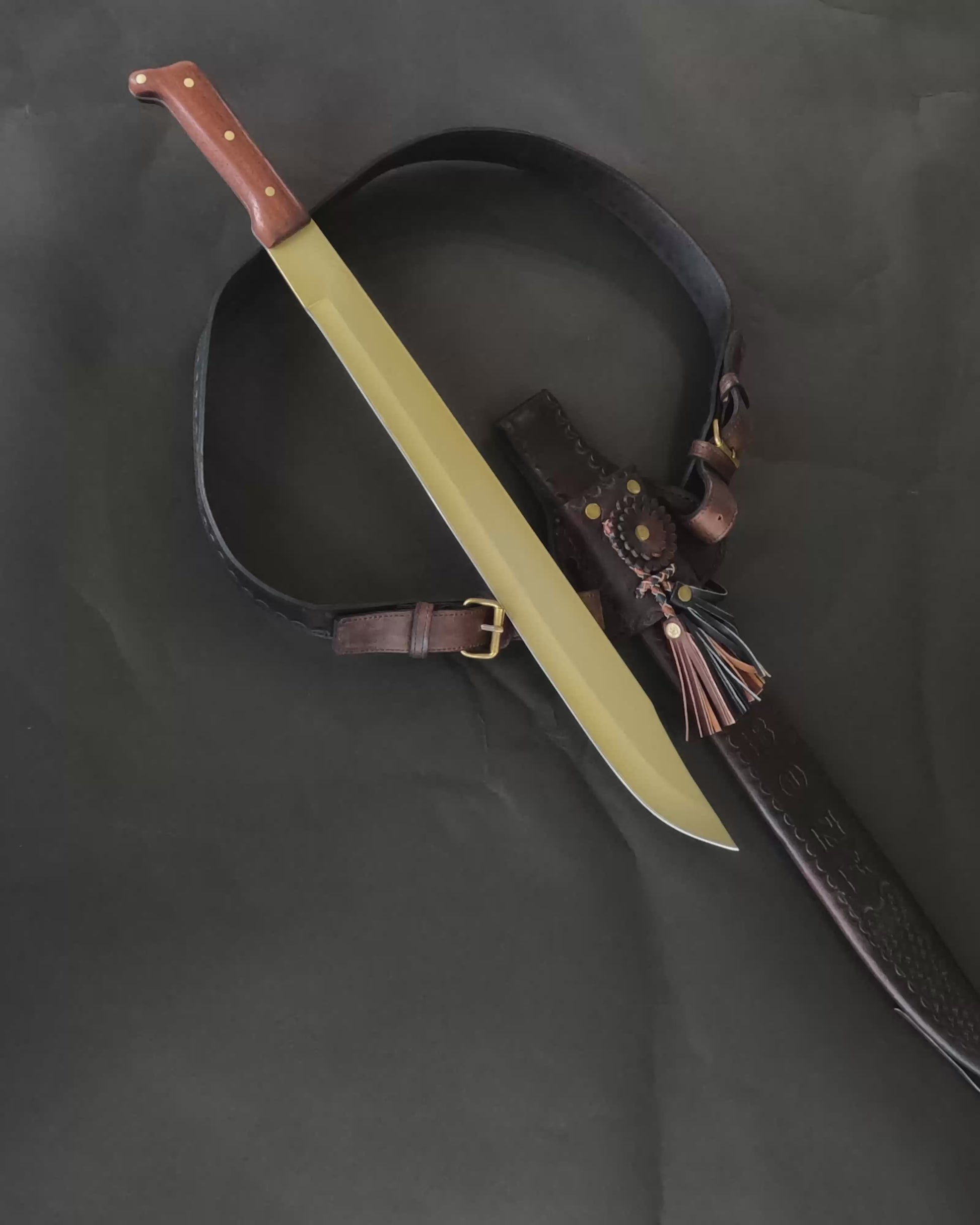 All our full-size machetes are professionally and individually heat treated in house, then hand sharpened until each achieves our famous shaving sharp edge. Finally, they are paired with the hand tooled top grade leather sheath of our proprietary design for quick access and easy carry... ready to be either worn on the belt or slung over the shoulder (with the included hand tooled leather shoulder strap). The finest machete on the planet is not everyone’s cup of tea, but if it strikes your fancy, and you’re lucky enough to drop by the website when one is in stock… this is the machete for you.
