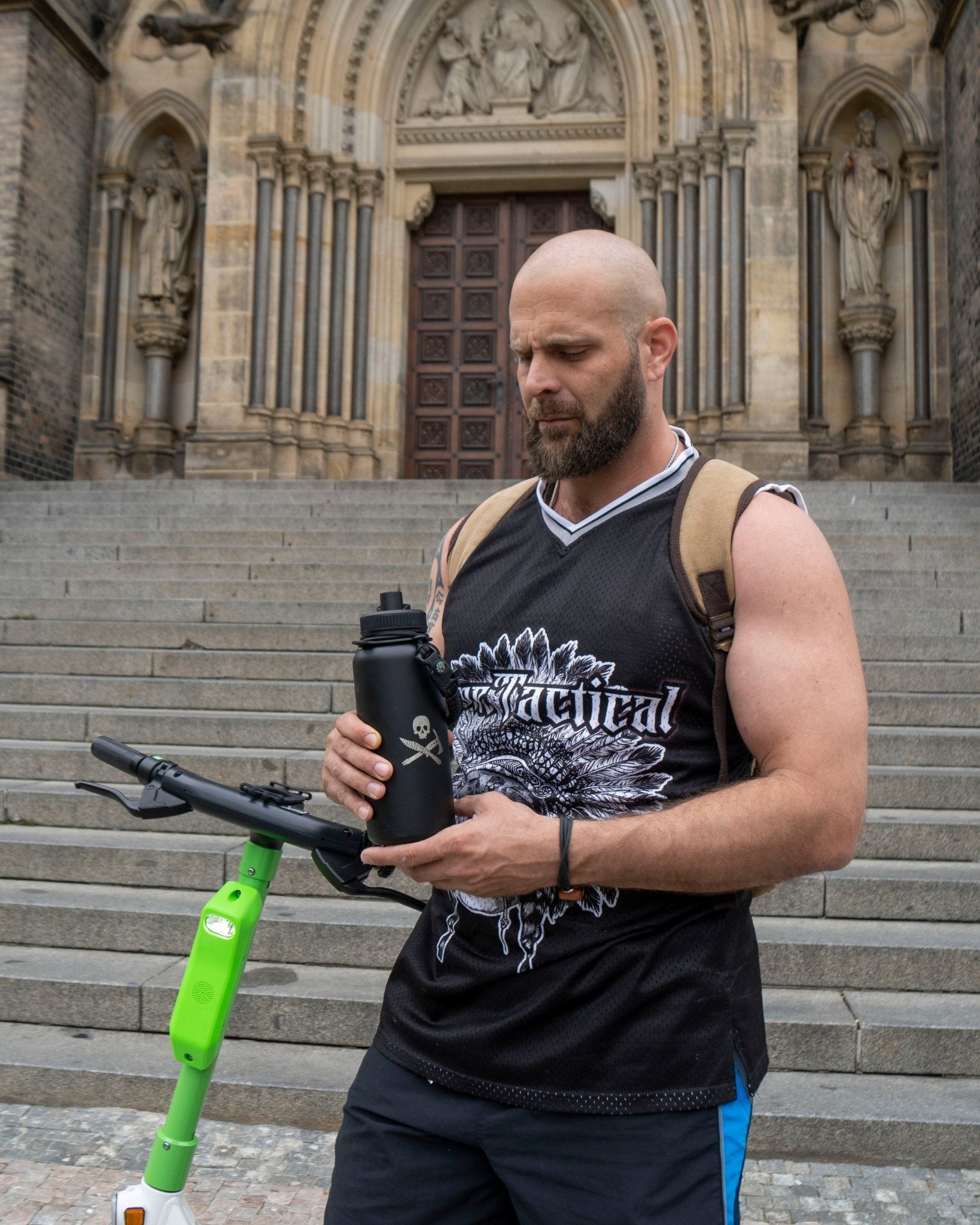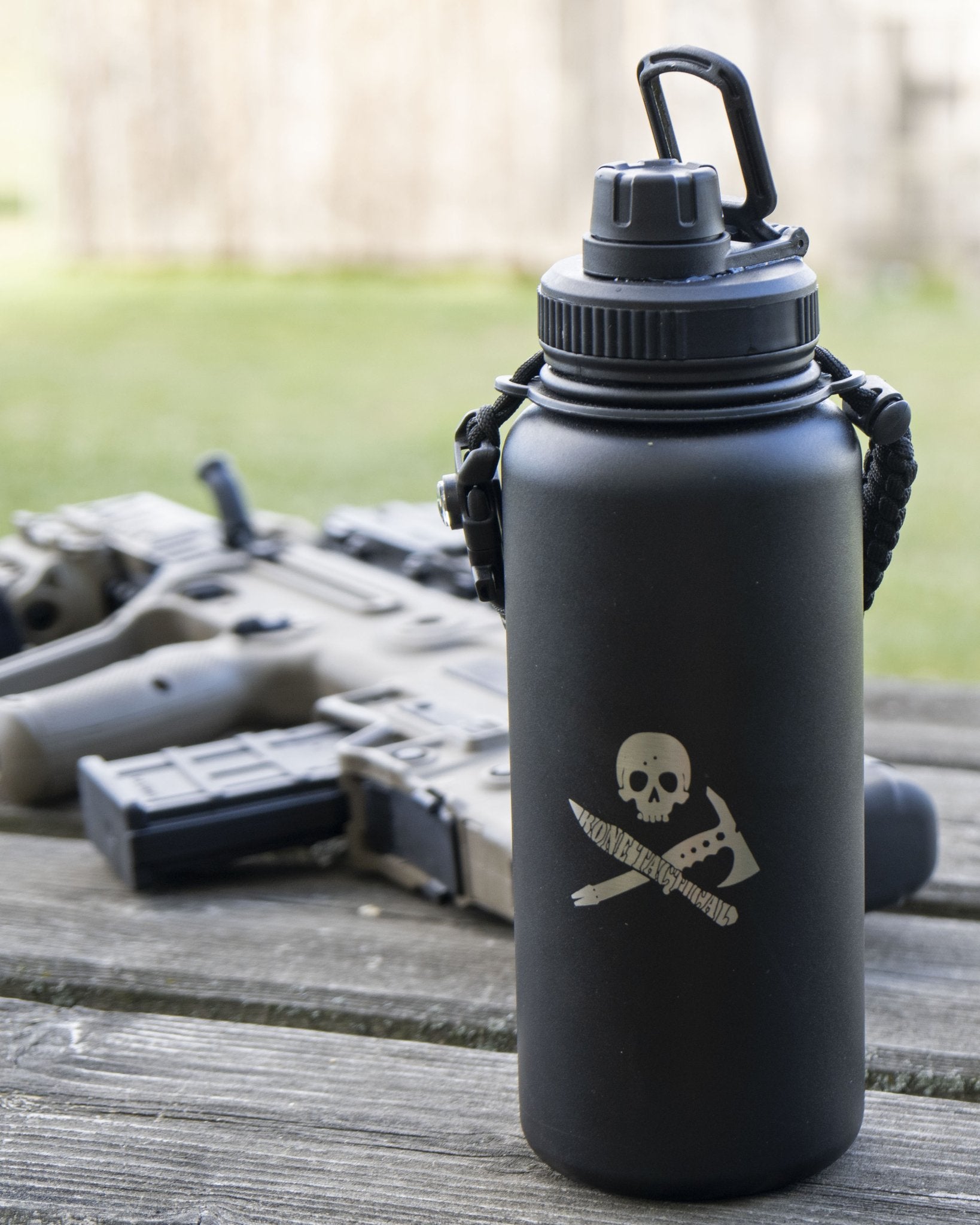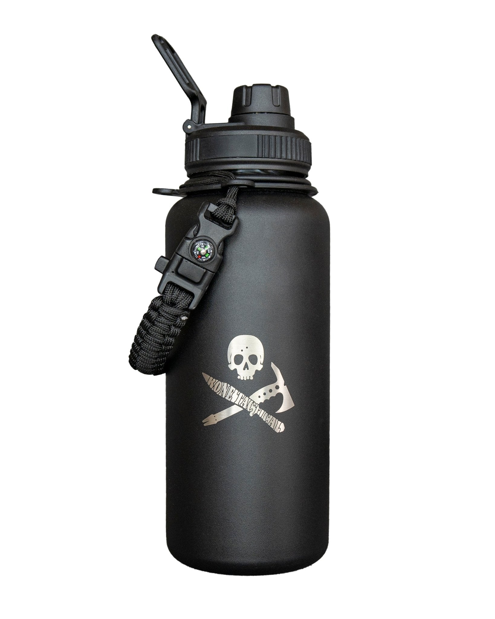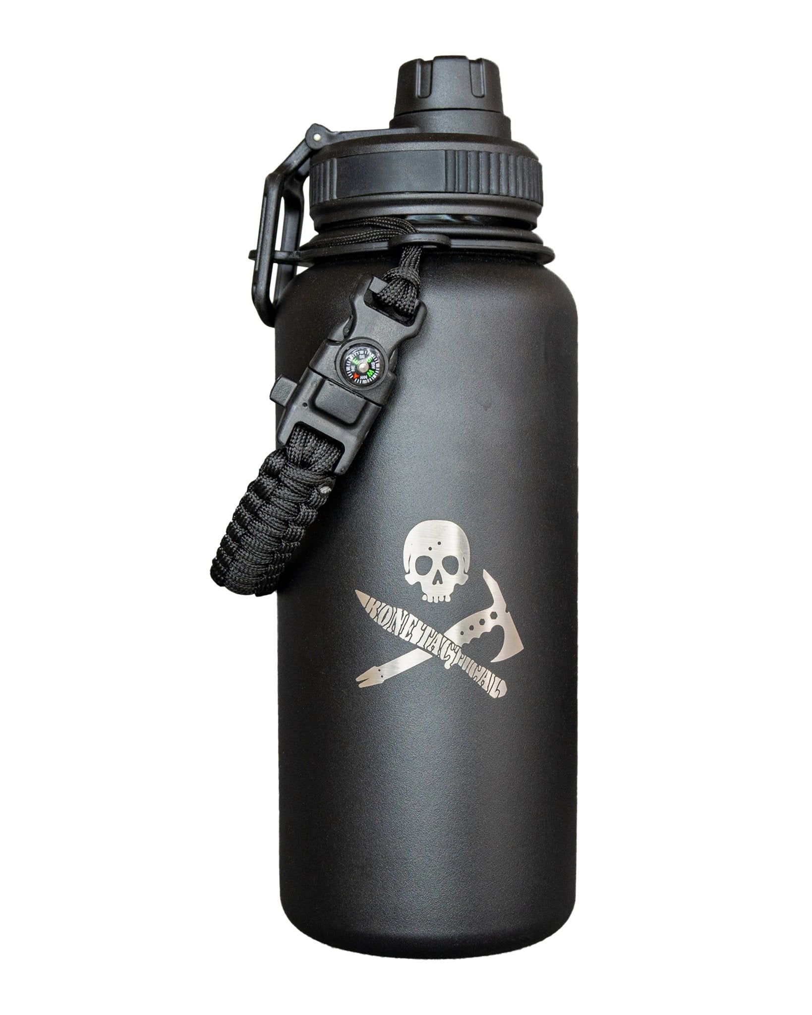 32 ounce, double walled, vacuum sealed 304 stainless steel construction. BPA free polymer flip lid with attachment loop, food grade silicone seal, and rubber grip ring. Bone Tactical wide mouth water bottles are built to last a lifetime. The double-walled vacuum technology keeps hot drinks hot and cold drinks ice cold all day long. The included extra paracord survival handle also features a compass, fire starter, knife, and whistle... all built in.