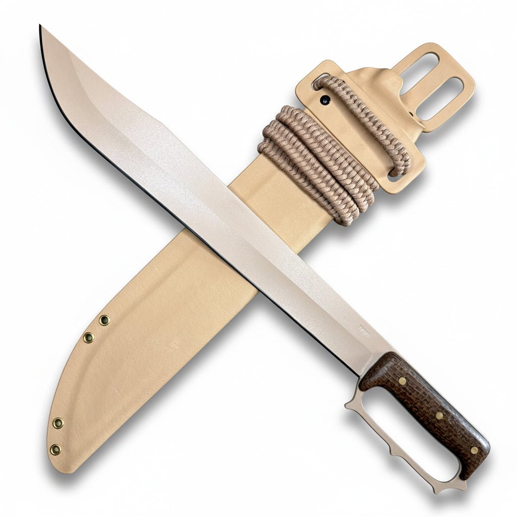 Its full knuckle guard protects the hand while doubling as an impact tool. The blade design combines the length of a short sword for truly impressive chopping and slashing with the "cola de gallo" (clip point) machete profile , ensuring excellent parrying, and thrusting capabilities—reminiscent of the massive cut down sabers and Bowie knives wielded with such efficiency during the American Civil War.