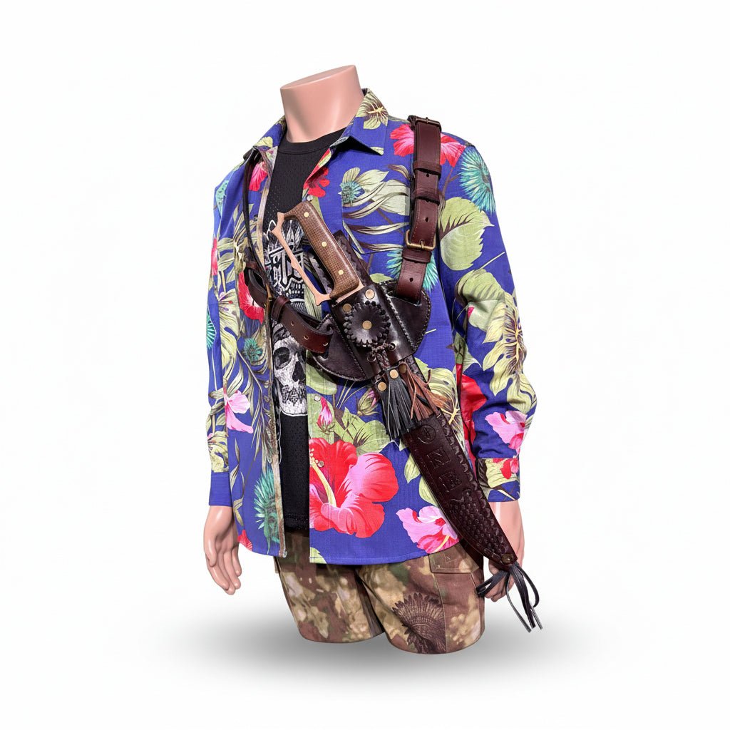 These innovate sheathes, made from the toughest and highest quality genuine saddle leather available, merge the collectability of hand-tooled artisan quality leatherworks with the modern adaptability of it's multi-carry system. Each sheath comes with a removable shoulder sling, cut from the same leather and finished to match, as well as a standard belt loop for outside the waistband hip carry. All accessories are made from a high quality bronze that won't rust... only patina along with the sheath. Like all Bone Tactical products, they're made to outlast the original owner.